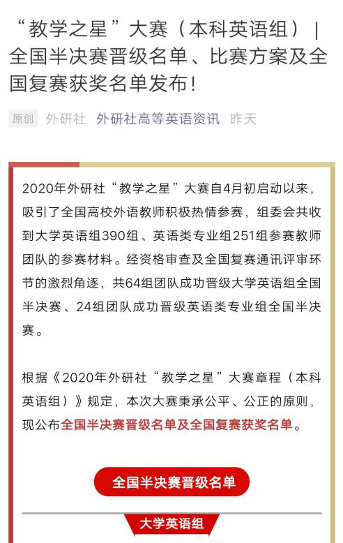 6月29日,我校人文与外国语学院大学英语教师团队(苗德全、张燕、李华颖、王群、莫玉梅)获得2020年外研社“教学之星”大赛全国复赛特等奖,顺利晋级全国半决赛。
