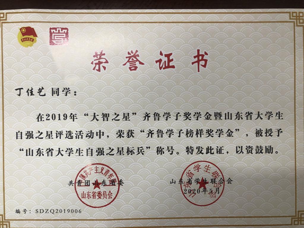 近日,由团省委、省学联、大智教育集团联合开展的2019年“大智之星”齐鲁学子奖学金暨山东省大学生自强之星评选结果揭晓。我校丁佳艺同学荣获大学组·榜样奖暨山东省“大学生自强之星标兵”(山东省仅评选10名),张仲梅同学荣获大学组·提名奖暨山东省“大学生自强之星”提名奖。