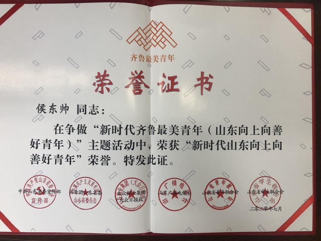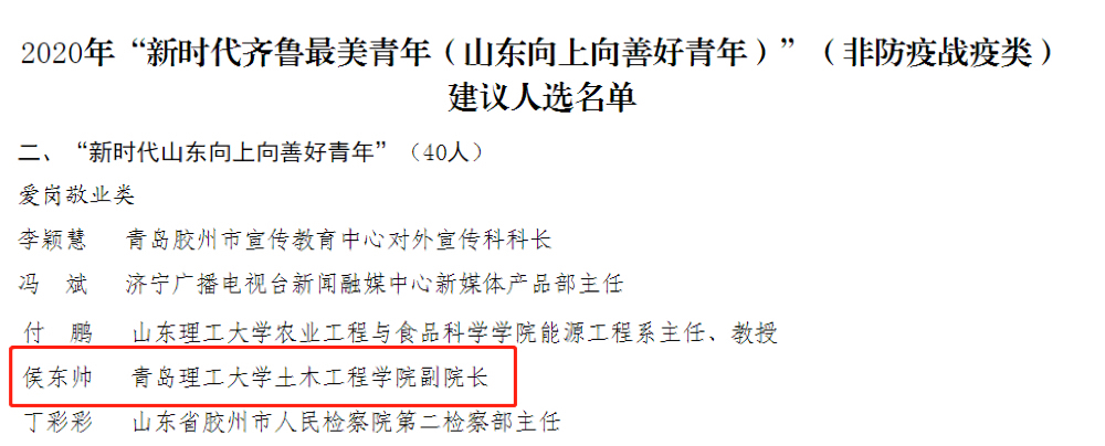 近日,由中共山东省委宣传部、共青团山东省委、大众报业集团、山东广播电视台、山东省青年联合会、山东省学生联合会联合举办的争做“新时代齐鲁最美青年(山东向上向善好青年)”主题活动评选结果揭晓。我校土木工程学院青年教师侯东帅荣获“新时代山东向上向善好青年”荣誉称号。