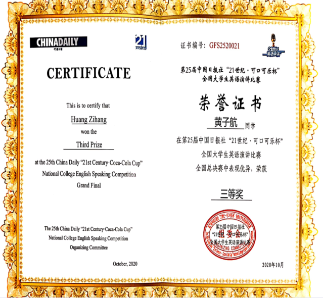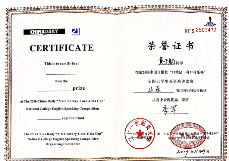 10月5-7日,由中国日报社与可口可乐中国联合主办、二十一世纪英语教育传媒承办的第25届中国日报社“21世纪·可口可乐杯”全国大学生英语演讲比赛全国总决赛在广东省广州市白云国际会议中心举办。我校商学院国际商务专业黄子航参赛,与来自清华大学、复旦大学、南开大学、外交学院等70余名选手同台竞技,荣获全国总决赛三等奖。此前,黄子航在该赛事山东赛区总决赛中获季军,与山东大学、中国石油大学(华东)两学子代表山东省参加全国总决赛。