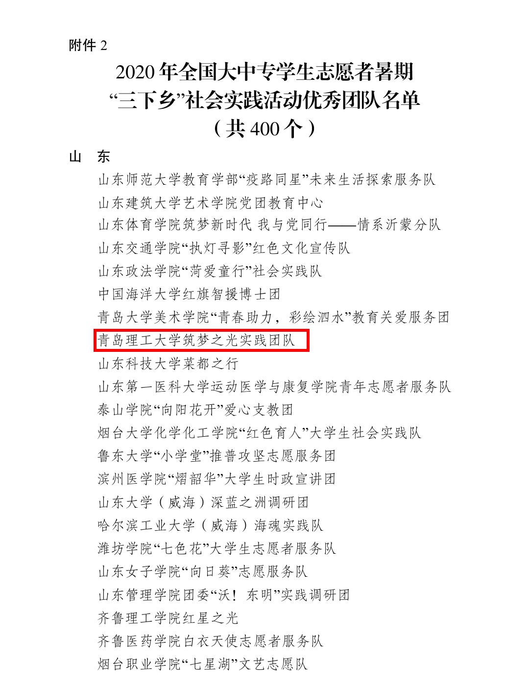 近日,团中央青年发展部发布通报,表彰在2020年全国大学生暑期“三下乡”社会实践专项活动中涌现出表现突出的400个集体。我校建筑与城乡规划学院“筑梦之光”赴杨家山里团队被评为“全国优秀实践团队”。