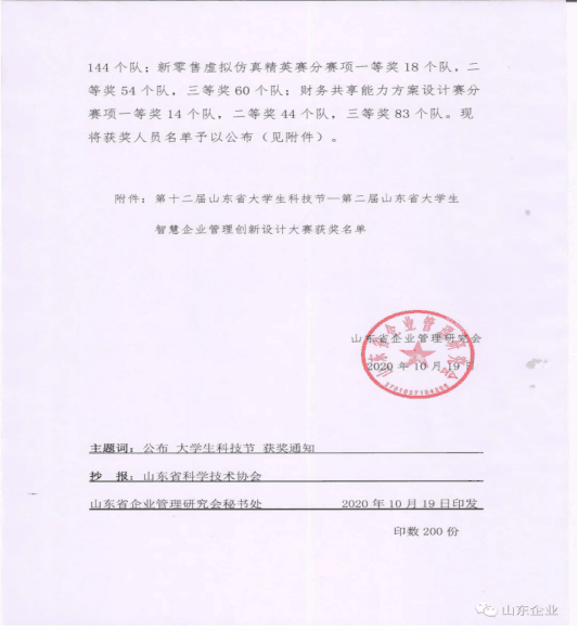 近日,由山东省企业管理研究会承办的山东省大学生智慧企业管理创新设计大赛举行,本次比赛是“第十二届山东省大学生科技节”赛事活动之一,共吸引了来自全省119所院校的1387支队伍参赛。我校商学院八支参赛队全部获奖,共斩获一等奖2项、二等奖6项。