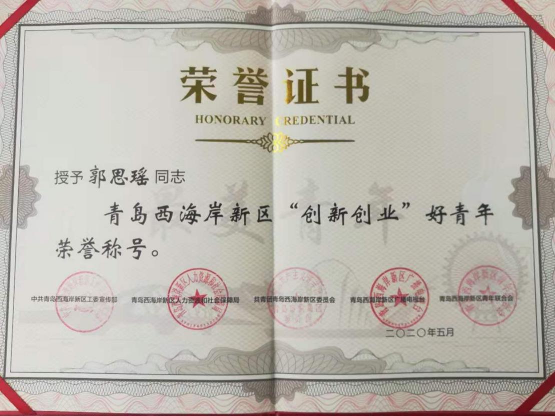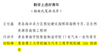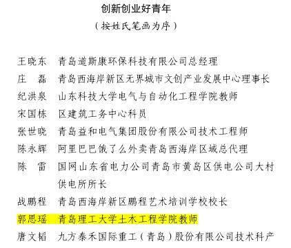 近日,由青岛西海岸新区工委宣传部等部门联合主办的“新区最美青年”评选活动获奖名单揭晓,我校土木工程学院郭思瑶老师获“创新创业好青年”荣誉称号,机械与汽车工程学院刘校峰同学获“勤学上进好青年”荣誉称号。