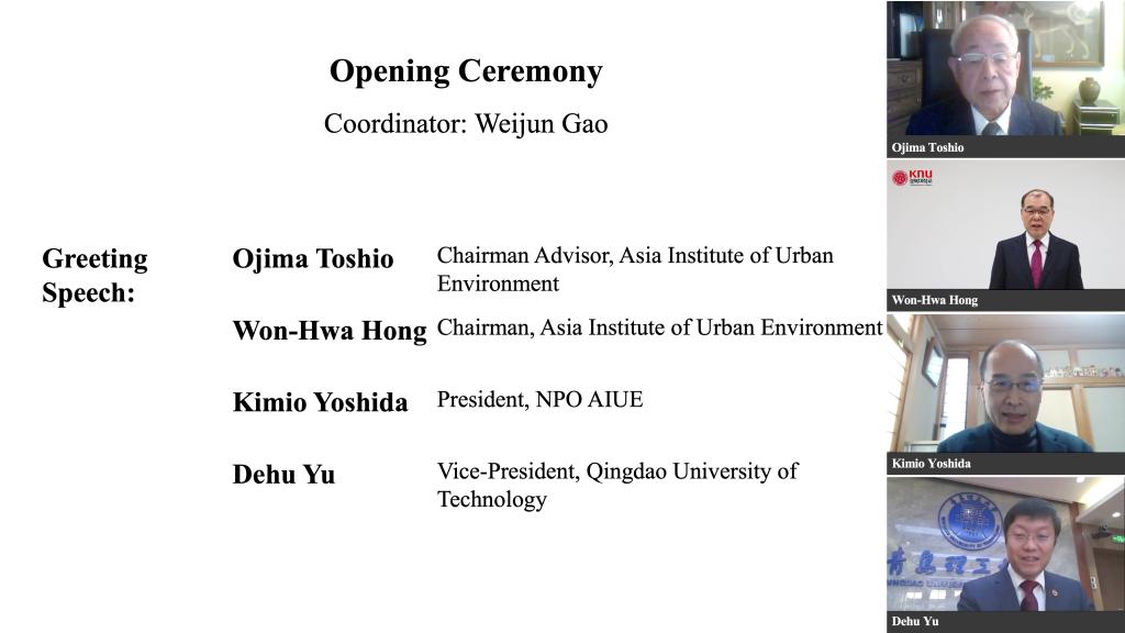 因受疫情影响,原定于青岛举办的线下会议推迟至2021年,本次以在线视频会议形式进行,由我校滨海人居环境学术创新中心首席科学家高伟俊院士担任开幕仪式主持人。AIUE顾问会长、早稻田大学顾问教授尾岛俊雄,AIUE会长庆北国立大学学校长洪元和、NPO AIUE主席吉田公夫及135名专家、学者齐聚会场。