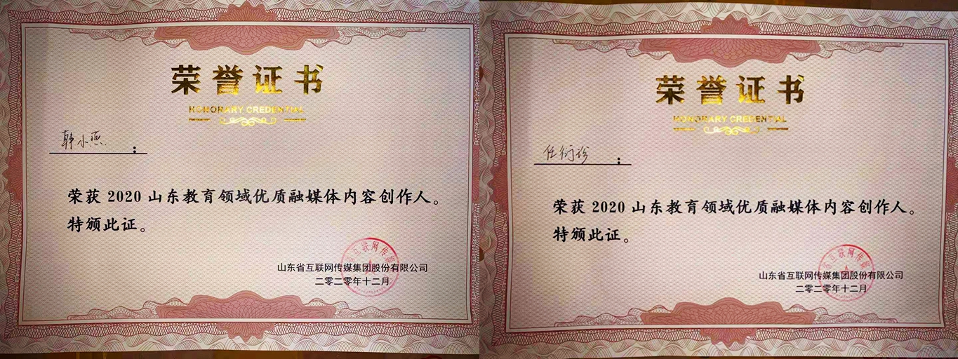 12月25日,由山东省互联网传媒集团主办的2020山东教育品牌建设与传播管理研讨会在济南召开。我校荣获“2020山东最佳社会声誉高校”(本科院校-精进奖)和“2020山东最具影响力教育政务融媒体”(本科高校)。韩小燕、任衍珍获评“2020山东教育领域优质融媒体内容创作人”称号。