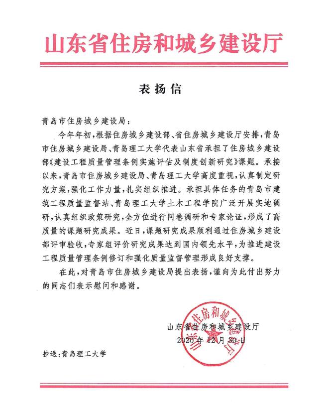 12月30日,我校收到山东省住房和城乡建设厅发来的表扬信,信中表达了对我校和青岛市住房城乡建设局承担的受住房和城乡建设部课题《建设工程质量管理条例实施评估及制度创新研究》顺利通过住房城乡建设部评审验收、且研究成果具有针对性和前瞻性,达到国内领先水平提出表扬。