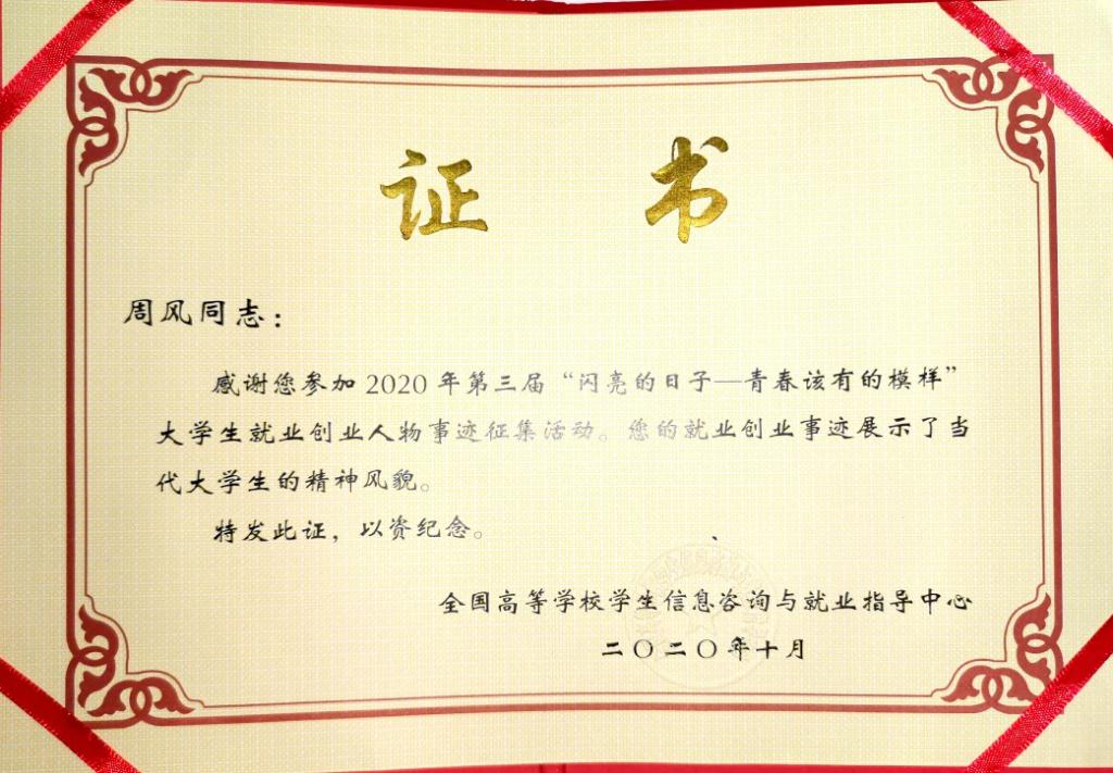 在2020年全国第三届“闪亮的日子——青春该有的模样”大学生就业创业人物事迹征集评选活动中,我校推荐的2016届毕业生周风成功入选。