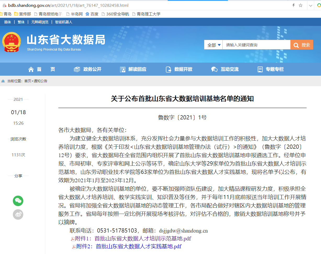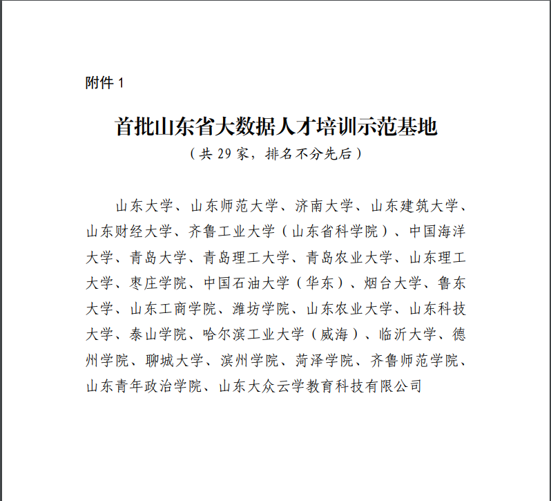 日前,山东省大数据局下发《关于公布首批山东省大数据培训基地名单的通知》,确定29家单位为首批山东省大数据人才培训示范基地,我校成功入选。
