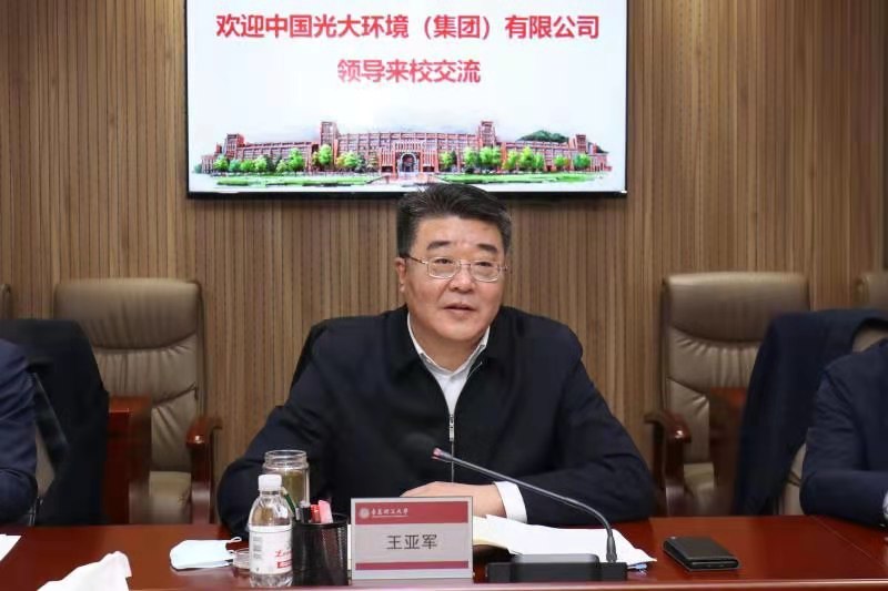 王亚军对王天义主席一行来校考察交流表示热烈欢迎,对中国光大环境(集团)有限公司对学校给予的信任支持表示感谢,并介绍了学校建设发展、主校区转移与2020年工作报告情况。