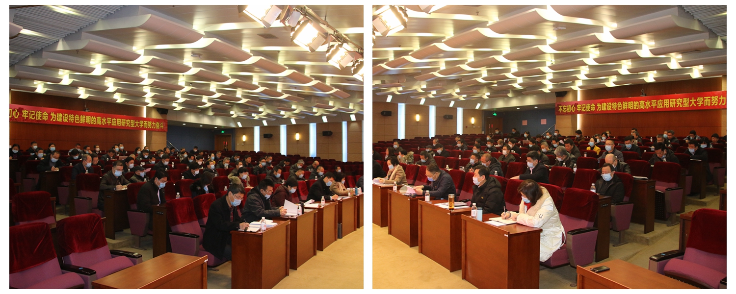 谭秀森在讲话时首先简要总结回顾了学校2020年主要工作,接着他指出,立足新发展阶段、贯彻新发展理念,构建新发展格局,都离不开一个“新”字。“新”是2021年工作的关键词:新时代、新目标、新理念、新举措、新要求。把握好这个“新”字,就把握好了全年的形势、任务、目标、要求。他重点围绕“新”字,对2021年的重点工作作部署。一是进入新时代,把握高等教育发展大背景。二是明确新目标,聚焦内涵建设。三是贯彻落实新理念,推进科学发展。要深化改革,创新发展;要系统思维,协调发展;要突出优势,特色发展;要合作共赢,开放发展;要共建共享,和谐发展。四是实施新举措,实现全面提升和重点突破。既要牢牢抓住“十大工程”这条主线,全面推进“十大工程”,毫不放松抓好常态化疫情防控工作;又要突出重点,把握好“四个着力”,实现重点突破,即:着力打造优势特色学科群专业群,着力推动大平台大团队大项目建,着力加强高水平师资队伍建设,着力提升治理能力治理水平。五是对确保各项工作落实到位提出新要求。要提高政治站位,提升专业水准,培养务实作风,强化担当精神,严格自律要求。
