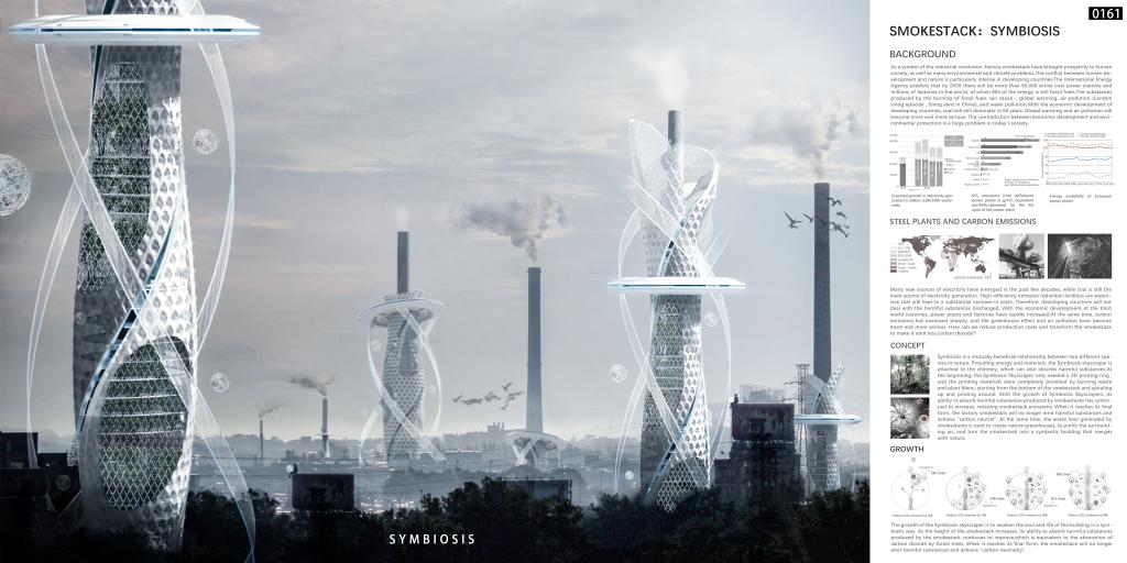 我校获奖作品《烟囱:共生》针对的是工业烟囱对环境的影响。Symbiosis摩天大楼依附在烟囱之上,烟囱为其提供能量和材料,Symbiosis摩天大楼吸收有害物。Symbiosis摩天大楼最开始只需要一个3D打印环,打印材料完全由烟囱燃烧的废物和植物纤维提供,从烟囱最底部开始螺旋上升环绕打印。随着Symbiosis摩天大楼的生长,其吸收烟囱产生有害物质的能力不断提高,减少烟囱的排放。当其达到最终形态,工厂烟囱将不再排出有害物,同时利用烟囱所产生的废弃热打造不同的植物温室,净化周围的空气,将烟囱变成与自然融合的共生建筑。实现“碳中和”。