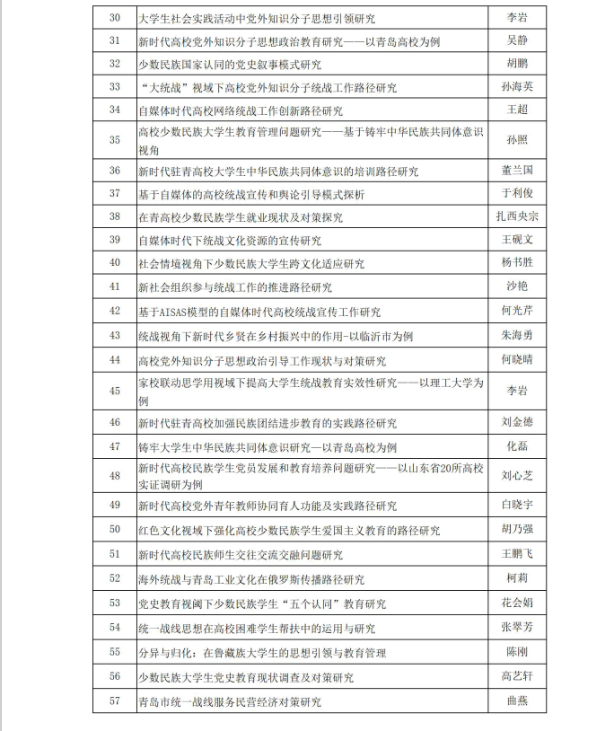 近日,中共青岛市委统战部公布了2021年度全市统战理论调研课题立项名单,我校共有57项课题获批立项,立项数量位列在青高校首位,创我校在该项目立项数量历史新高。2021年度青岛市统战理论调研课题共立项360项,其中在青高校立项241项,我校立项57项。