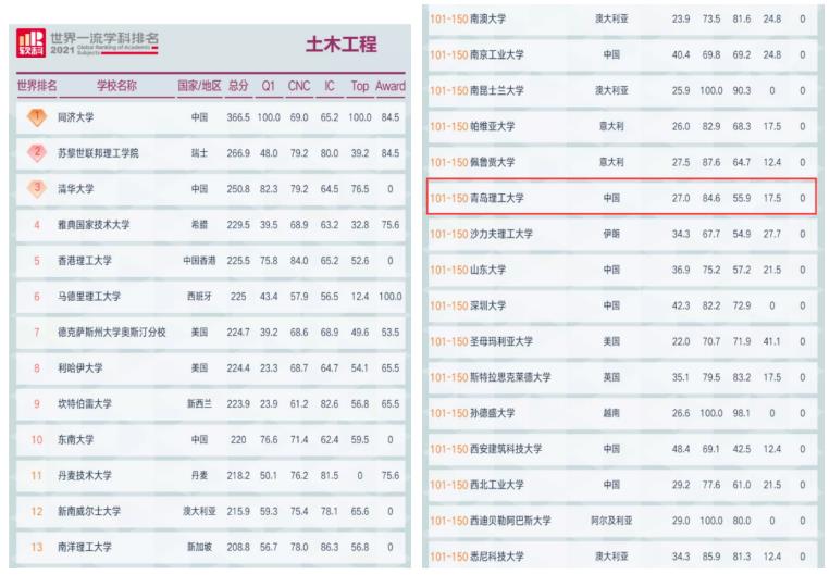 日前,软科公布了2021世界一流学科排名。在土木工程学科中,全球共有300所高校上榜,其中,中国共有67所大学(内地60所)。同济大学、清华大学、东南大学等20所内地大学位列土木工程学科前100名;永利集团3044官网欢迎您、长安大学等11所大学位列全球土木工程学科101-150名,其中,永利集团3044官网欢迎您土木工程学科稳居山东省属高校首位。