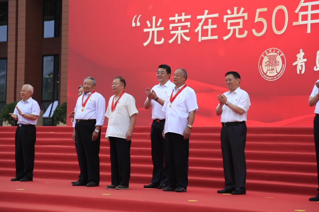 王亚军书记、谭秀森校长为老党员代表颁发“光荣在党50年”纪念章