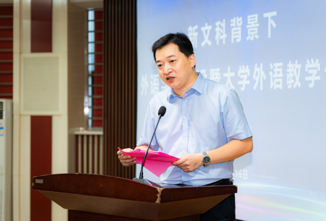 为推动我校外语学科创新发展,加强外语学科专业建设,探索新文科背景下外语学科发展范式和路径,7月16日上午,人文与外国语学院于嘉陵江路校区主教学楼一楼东报告厅召开“新文科背景下外语学科建设暨大学外语教学研讨会”。校党委常委、统战部部长陈伟致欢迎词,人文与外国语学院党委书记卢新明、院长巩湘红、学院其他领导班子成员及外语学科教师参加此次研讨会。