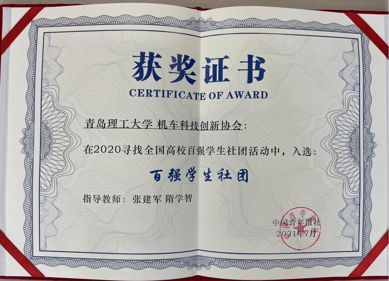 我校机车科技创新协会获评“2020年全国高校百强学生社团”荣誉称号,充分展现了我校学生社团建设成果。校团委将继续深入推进学生社团规范化建设,持续探索社团工作新举措,引导学生社团开展既具思想性,又具社团属性的校园文化活动,充分发挥学生社团在“三全育人”中的积极作用,不断推动社团健康有序规范发展。(撰稿:张建军、曲乐;审核:李忠晓、王鹏飞)