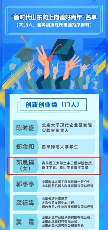 9月8日,由中共山东省委宣传部、共青团山东省委、大众报业集团、山东广播电视台、山东省青年联合会、山东省学生联合会联合举办的争做“新时代齐鲁最美青年(山东向上向善好青年)”主题活动评选结果揭晓。我校土木工程学院青年教师郭思瑶荣获“新时代山东向上向善好青年”荣誉称号。