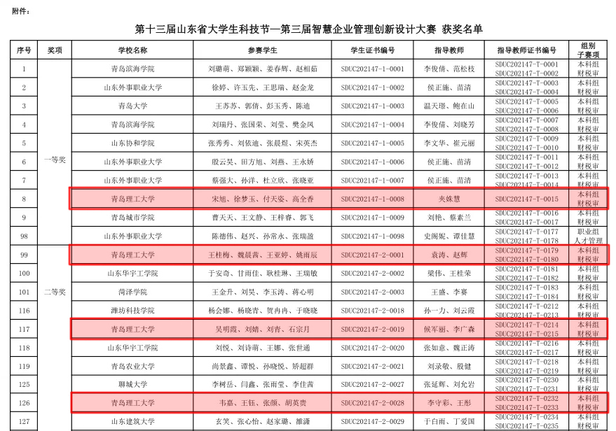 近日,由山东省科学技术协会、山东省教育厅、共青团山东省委员会等部门联合主办的第十三届山东省大学生科技节——第三届智慧企业管理创新设计大赛成绩揭晓,临沂校区选派的4支队伍斩获一等奖1项、二等奖3项的好成绩。