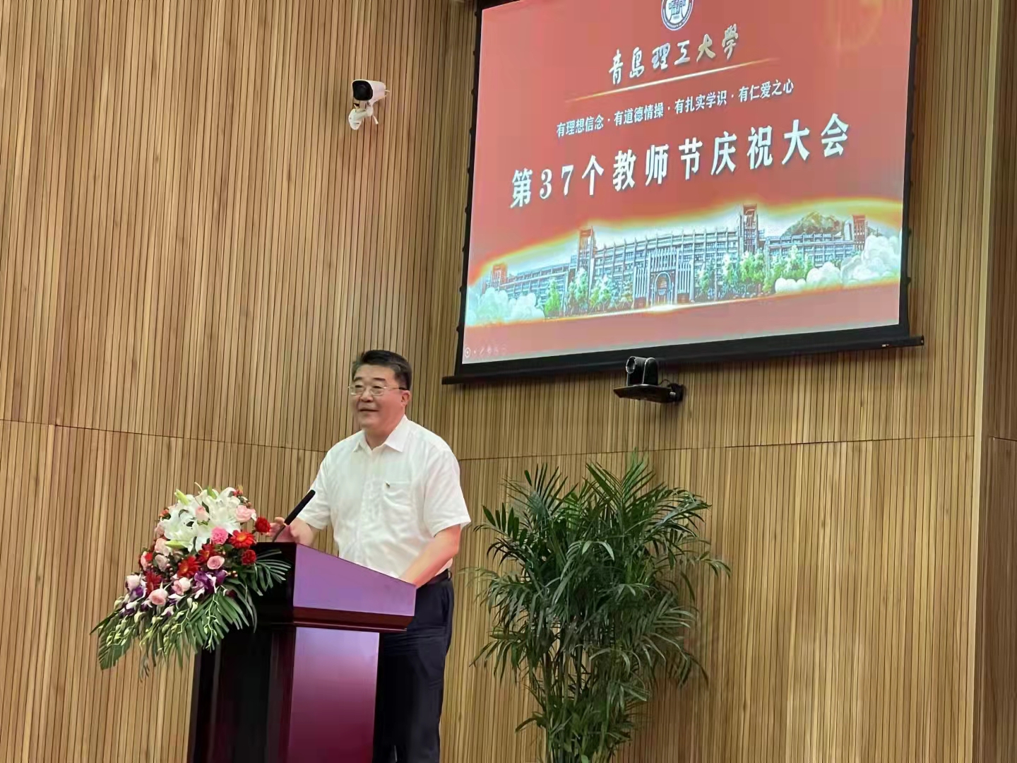 党委书记王亚军代表学校党委、行政,向“从教满30年”的教师们表示崇高的敬意,向受表彰的先进集体和优秀教师们表示热烈的祝贺,向辛勤耕耘、默默奉献的全校广大教师致以节日的祝贺和诚挚的祝福。