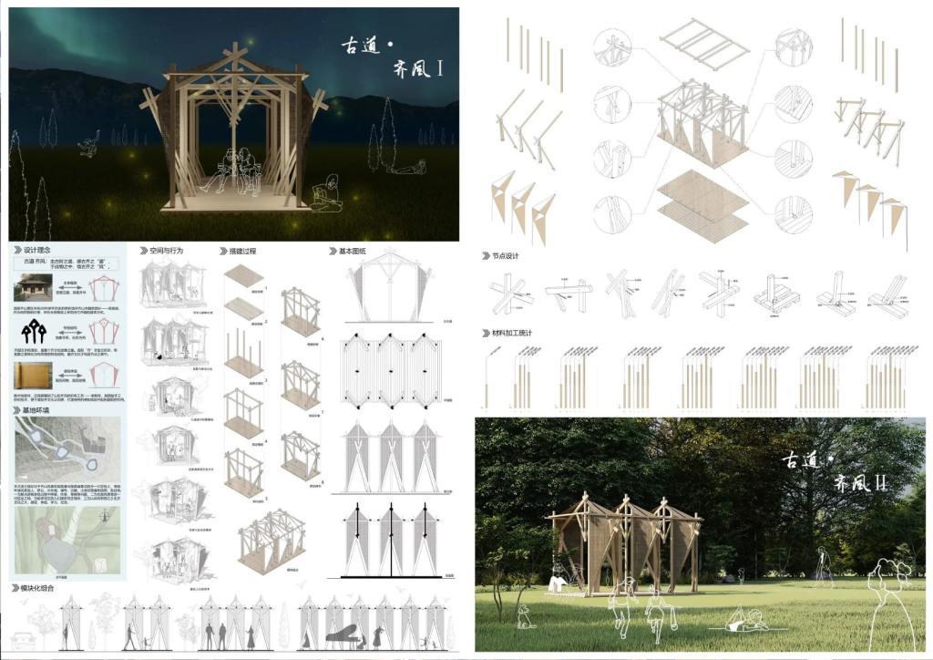 《古道·齐风》团队设计了由观音庙简化而来的主体结构,将“齐”字的金文形态融入其中,做到将文化融于造型和结构之美中,融入了环境,也代表了文化,又立于古道之上,所以有了以下这段话:走古时之道,感古齐之“道”,于此物之中,悟古齐之“风”。作品构筑物模块化的组合方式,便于空间的整合和划分。中间模块的位置错动,会为构筑物的功能提供多种可能性。