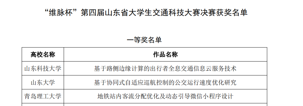 近日,由山东省大学生科技文化艺术节组委会主办,山东公路学会、山东省交通院校联盟、山东科技大学承办的“维脉杯”第四届(2021年)山东省大学生交通科技大赛圆满结束。我校机械与汽车工程学院、管理工程学院共派出6支队伍参赛,最终获得一等奖1项,二等奖3项,优秀奖2项的优异成绩。