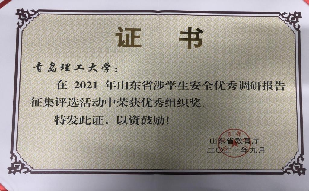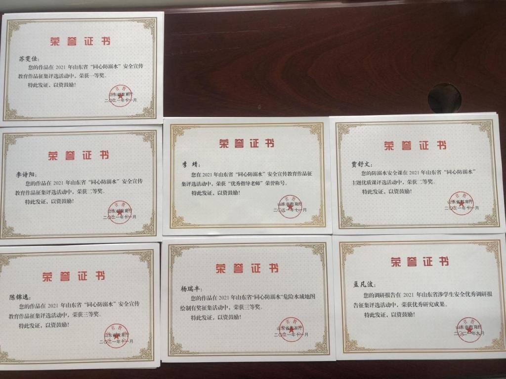 其中,在专项活动中获2021年山东省“同心防溺水”安全宣传教育主题活动和2021年山东省涉学生安全优秀调研报告征集评选活动优秀组织奖;在2021年山东省涉学生安全优秀调研报告征集评选活动中4人获优秀调研成果奖;在2021年山东省“同心防溺水”安全宣传教育作品征集评选活动中5人获“优秀指导老师”荣誉称号,7人获一等奖,3人获二等奖,5人获三等奖;在2021年山东省“同心防溺水”主题优质课评选活动中2人获二等奖,3人获三等奖;在2021年山东省“同心防溺水”危险水域地图绘制有奖征集活动中5人获三等奖。