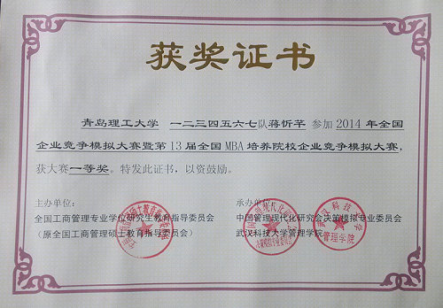 4月30日,2014年全国企业竞争模拟大赛暨第5届(2014)全国高等院校企业竞争模拟大赛暨第13届(2014)全国MBA培养院校企业竞争模拟大赛全国现场总决赛在武汉科技大学落下帷幕。我校商学院由任孔冰老师和贾玉跃老师指导,蒋忻芊、李林华、胡志敏同学组成的代表队在MBA组别中脱颖而出,荣获全国现场总决赛一等奖,同时获得第5届全国高等院校企业竞争模拟大赛高校组三等奖,这是山东高校在本次比赛中取得的最好成绩,也是我校首次荣获此项赛事的一等奖。