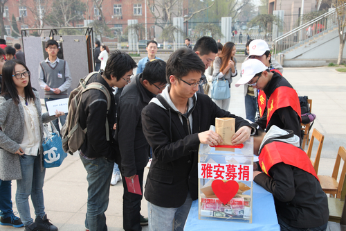 为表达对灾区的关怀,为抗震救灾工作贡献自己的一份力量,由校团委、校学生联合会等各个团学组织联合开展了“心系雅安 奉献爱心”为雅安灾区募捐、微博寄语、微信传情等系列活动。