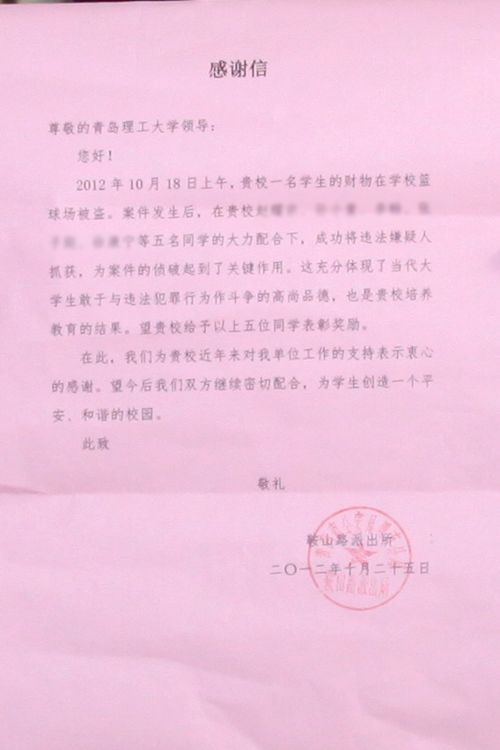 日前,鞍山路派出所给我校发来感谢信,表扬我校学生为案件侦破提供重要帮助,对他们见义勇为、敢于与违法犯罪行为作斗争的高尚品德给予高度肯定。