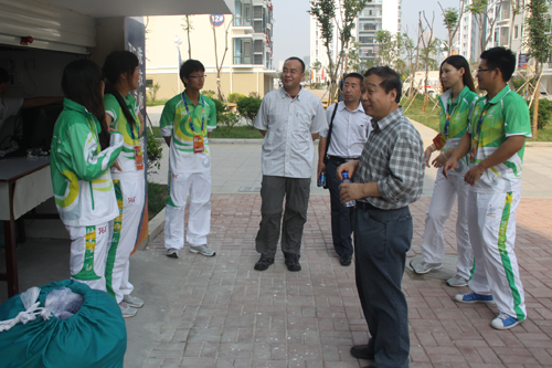 杨向荣副书记在抵达亚沙会组委会后,在烟台团市委领导的陪同下相继走访志愿者餐厅与志愿者宿舍,详细询问志愿者的餐饮和生活状况,代表学校向同学们表示慰问和感谢。之后前往运动员村,先后走访欢迎中心、访客办证中心、团队办公室、住宿咨询台等志愿服务岗位,切实了解志愿者工作情况,对志愿者的默默奉献和辛勤劳动给予了肯定和表扬,同时对全体志愿者提出要求,希望全体志愿者继续发扬“奉献、友爱、互助、进步”的志愿服务精神,以饱满的热情、细致周到的服务做好志愿者工作,为学校争光,为亚沙盛会的成功举办贡献自己的力量。