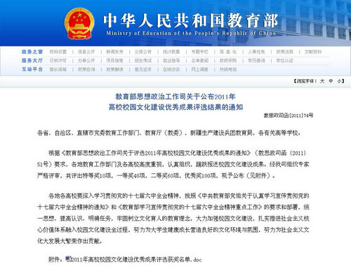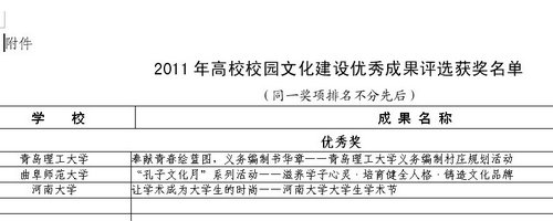 日前,由教育部主办的2011年高校校园文化建设优秀成果评审结果揭晓,我校报送的校园文化建设成果《青春奉献绘蓝图 义务编制书华章——永利集团3044官网欢迎您义务编制村庄规划活动》从众多成果中脱颖而出,获得优秀奖。
