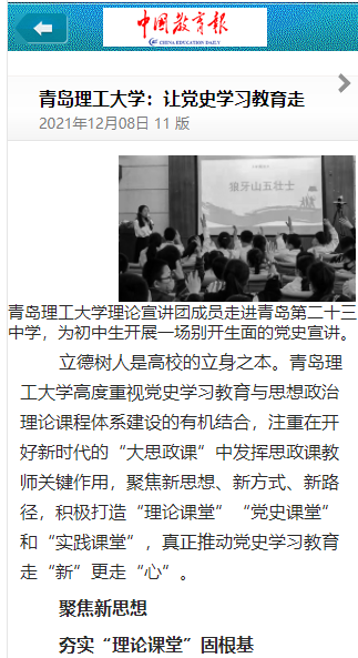 教师以党史教育“学习日”活动为有力抓手,当好党员和教师的双重角色,通过研读原著、专题培训、集体备课会、党史课题研究等形式,系统学习百年党史,深化对马克思主义基本原理和马克思主义中国化的认识;通过邀请专家线上线下专题讲座、组织党员到中国广电·青岛5G高新视频实验园区等教育基地参观学习、举办马克思主义学院青年学者学术论坛等活动,为学好新思想、讲好党的历史提供强有力的学理支撑;一批青年教师出版学术专著、发表高水平教科研论文,为理直气壮讲好党史学习教育这堂思政“必修课”筑牢了坚实的理论根基。
