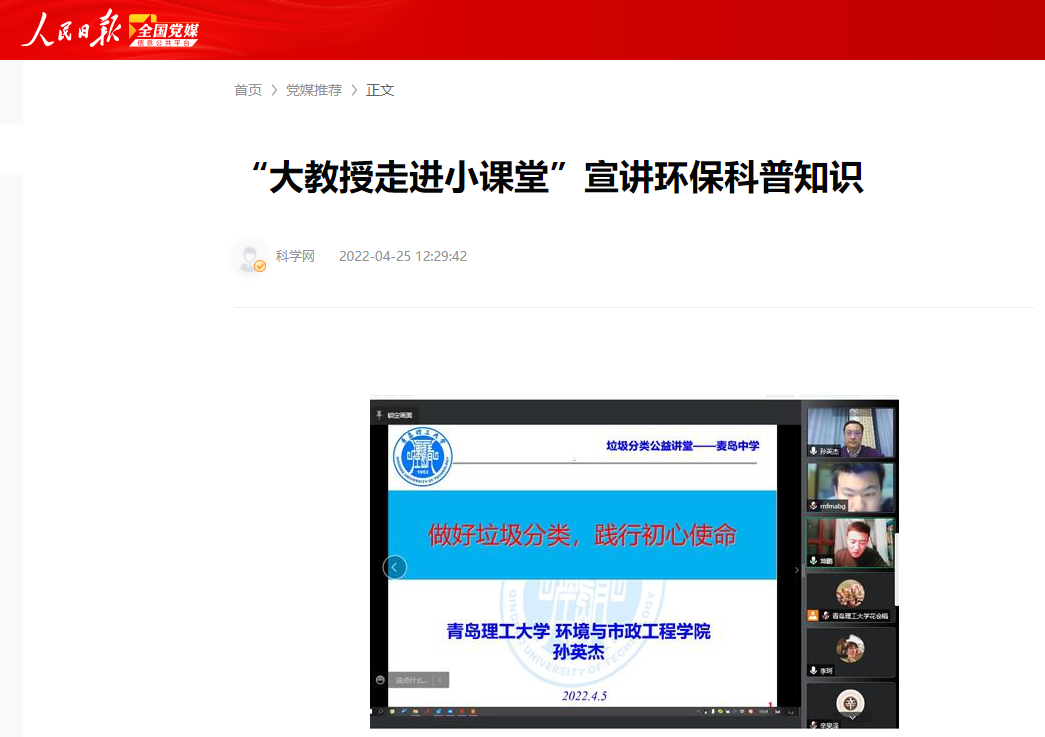 人民日报/科学网:“大教授走进小课堂”宣讲环保科普知识