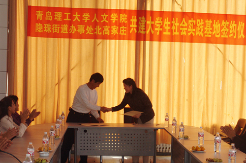 10月5日上午,人文社科学院院长谭业庭、书记陈稷玲一行,前往胶南市隐珠街道办事处北高家庄村委会签定了共建大学生社会实践基地协议,并在签订协议后,举行了揭牌仪式。双方在今后的学生公共政治理论精品课建设、专业学习实践环节、网络培训、社区文化、技能培训等方面达成长期的合作意向。