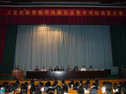 大会首先由院长谭业庭作动员讲话,主要从本科评估的重要性、如何加强学风建设、规范日常行为等三个大的方面为同学们作了动员讲话。谭院长在讲话中指出迎接评估是我校在这一段历史时期内的头等大事,本科教学评估与同学们的切身利益密切相关,评估的根本目的将进一步强化本科教学的中心地位,加大教学投入,努力提高师资队伍的素质和水平,加强教学管理,提高教学效果,使广大学生在知识、能力、素质等方面都有更大的提高;评估的结果关系到学校的社会声誉,好的评估结果将会对学生的就业和社会发展产生积极影响。教育部本科教学工作水平评估是本科教学工作的国家级“质量认证”。本科教学水平评估是国家教育部对我校教学质量、办学理念的一次全面检查,能够充分体现一所高等院校办学水平、办学层次和办学质量,有利于促进学校加强学校建设,改善教学环境,提高师资力量,增强学校的核心竞争力。谭业庭院长要求同学们把本科教学评估当作一次挑战,更是一次机遇,以饱满的热情、积极的态度做好本科教学评估前的一切准备工作,为学校本科评估的成功添上自己浓墨重彩的一笔。在谈到学风建设的时候,谭院长认为“态度决定一切,细节决定成败”,他要求同学们要秉承“养天地正气,法古今完人”的院训,以良好的学习状态,优秀的学习成绩,严明的学习纪律,展现出同学们良好的学习风气和氛围。对于日常行为规范,谭院长要求同学们要有慎笃的自律精神,严于律己,树立远大的人文理想,规范自己的日常行为,注意自己的言谈举止和待人接物,从小事做起,从现在做起,做一名合格的大学生。