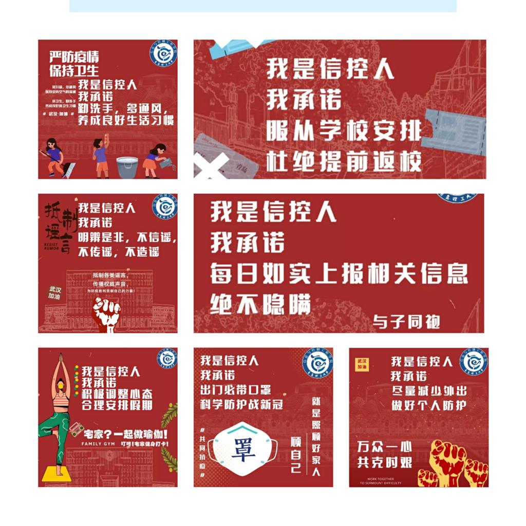 “我是信控人,我承诺”线上活动,号召全院师生尽量减少外出,做好个人防护;出门必带口罩,科学防护战新冠;勤洗手,多通风,养成良好生活习惯;明辨是非,不信谣,不传谣,不造谣;每日如实上报相关信息,绝不隐瞒;积极调整心态,合理安排假期;服从学校安排,杜绝提前返校。