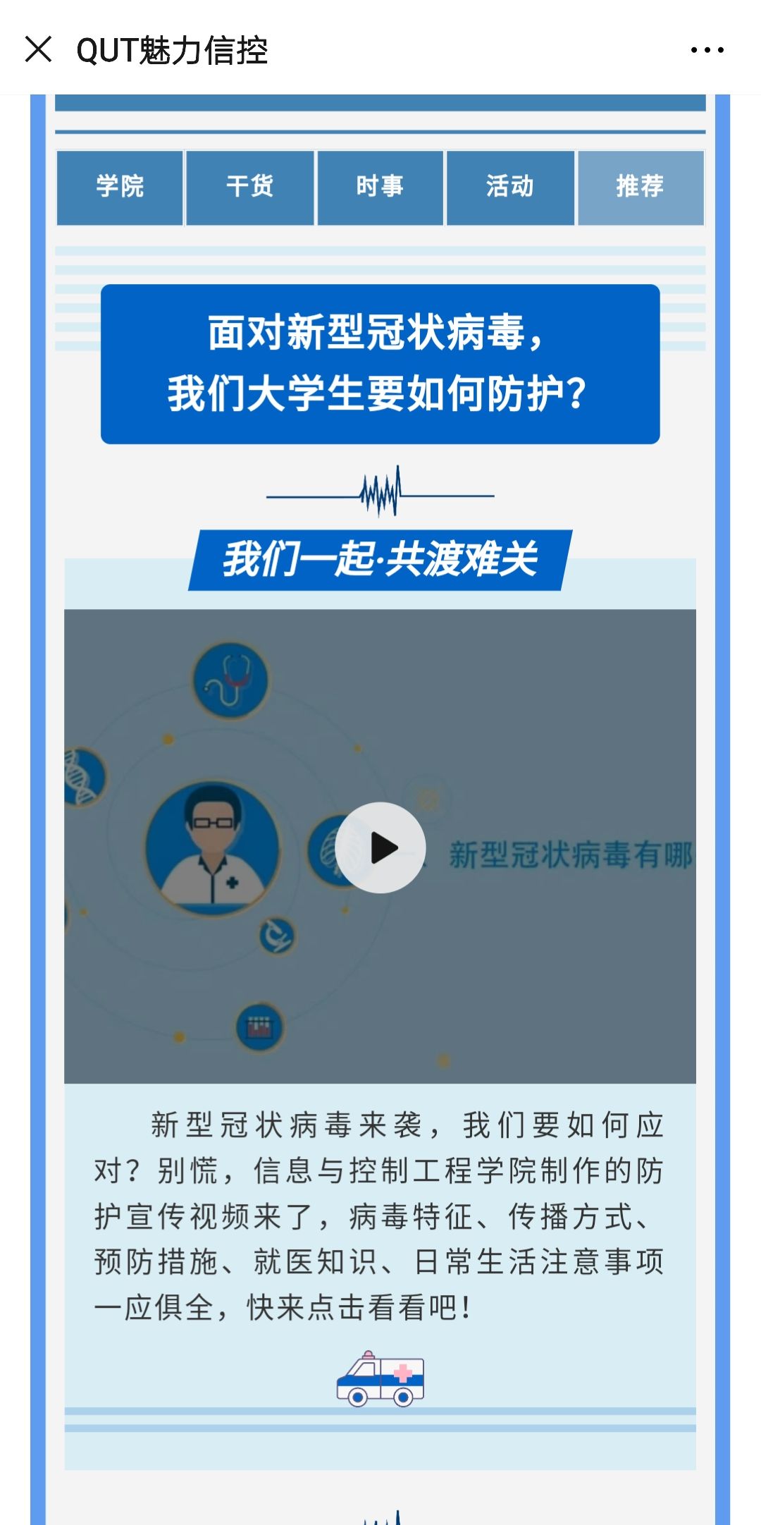 学院 “QUT魅力信控”微信号发布了《预防新型冠状病毒宣传片》,宣传科学防护知识,用通俗易懂的动画形式,普及新型冠状病毒的症状、传播方式、预防措施以及学校要求的“九严禁”。