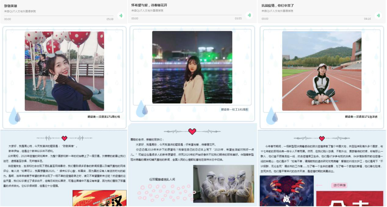 为增强战胜疫情信心,传递正能量,人文与外国语学院特此开展“‘疫’起发声——携手同行,待春暖花开”线上原创朗诵作品宣传主题团日活动。本次活动在学院各个团支部内广泛征集作品,学院微信公众号先后推出四期特辑专栏进行展示。此次线上主题团日活动,不仅为学院学生提供了一个为战胜疫情助力的平台,更是向一线工作者致以敬意,以音频的形式讲出了青年学生心中的关切,抒发了对武汉的加油和伟大祖国的美好祝愿。