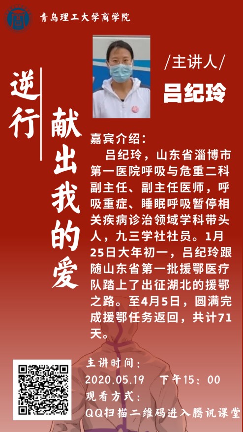 为讲好战“疫”思政课,激发爱国主义热情,增强学生的责任感和使命感,5月19日下午,商学院特邀山东省第一批援鄂医疗队队员、淄博市第一医院呼吸与危重二科副主任吕纪玲医生,通过网络“云课堂”的形式为学院师生带来题为《逆行,献出我的爱》的专题讲座。本次讲座由薛诚老师主持,商学院部分专业教师,全体学工干部,全体学生参加。