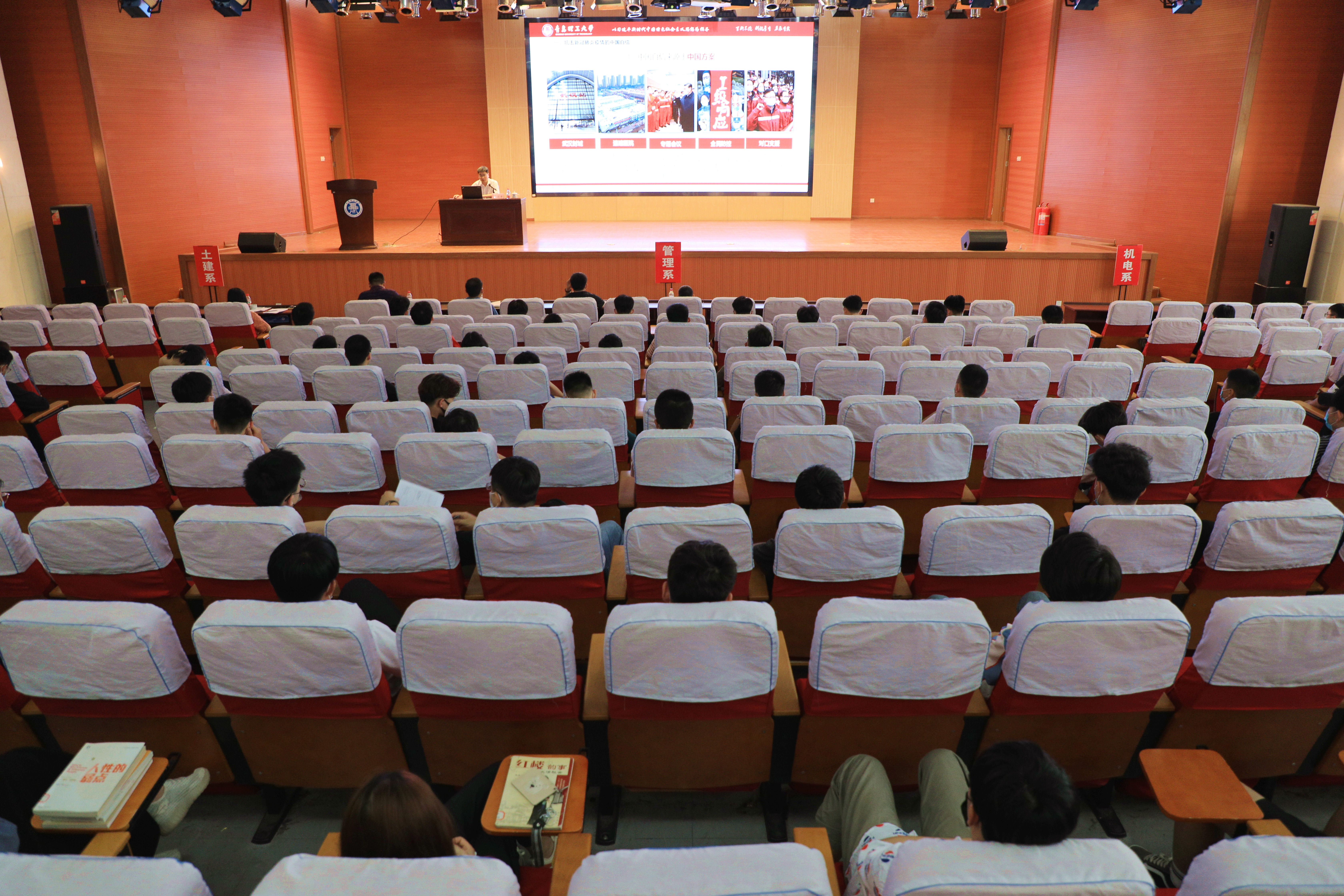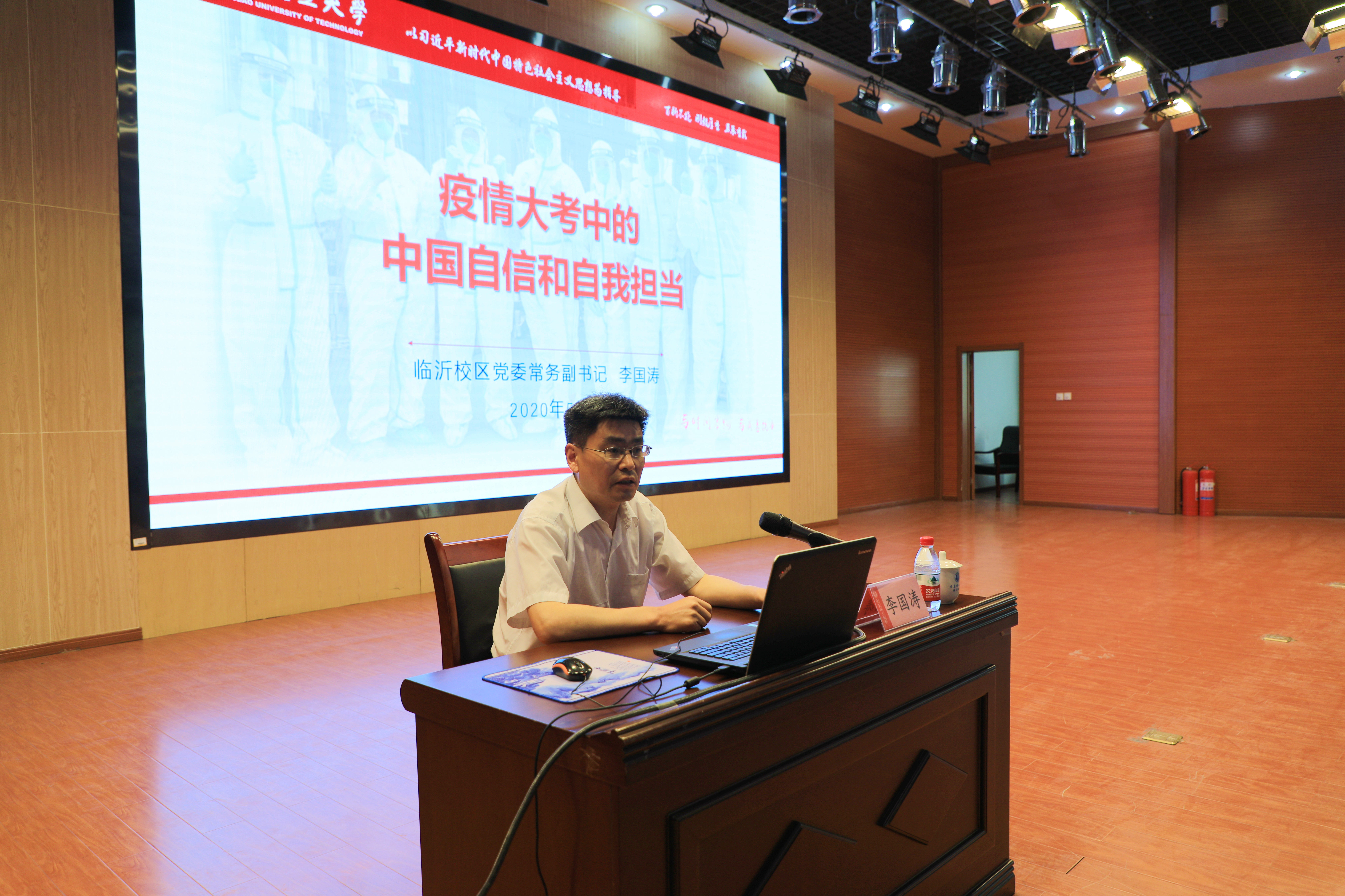 聚焦疫情防控,厚植爱国情怀,彰显中国自信,体现责任担当。李国涛以《疫情大考中的中国自信和自我担当》为题,带领学子重温抗疫感人事迹坚定战“疫”必胜信心。课堂上,他结合疫情防控中涌现出的大量生动的育人素材,有温度、有高度地展现了“抗击新冠肺炎疫情的中国自信”,深刻阐述了中国自信背后的中国方案、中国担当、中国制度、中国精神、中国力量;重点讲述了疫情防控期间,校区一盘棋、拧成一股绳,迅速精准高效落实疫情防控措施,在同心抗疫中落实立德树人根本任务,展示抗疫、育人的理工担当。李国涛指出,党的全面领导是战胜疫情的根本保证,中国抗疫伟大实践生动彰显了中国特色社会主义制度强大的号召力、凝聚力和优越性。李国涛勉励同学们要牢记使命担当,遵守校区防疫要求,树远大理想,立报国之志,成强国之才,以实际行动积极审慎作答开学复课这张考卷。