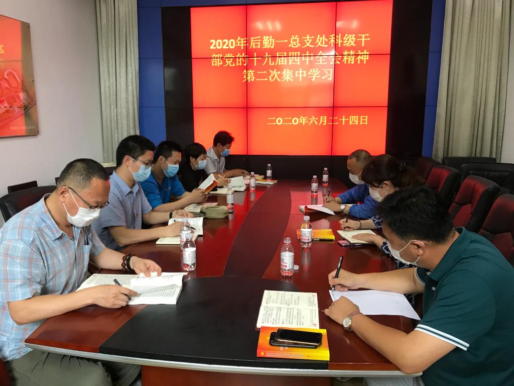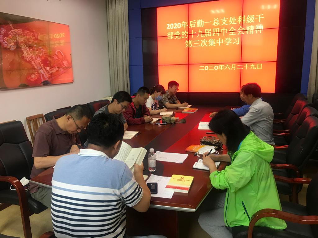 为了深入学习贯彻党的十九届四中全会精神,进一步提升全体处科级干部的理论水平,按照党委组织部《关于组织做好处科级干部党的十九届四中全会精神集中学习的通知》要求,后勤一总支积极筹措,认真落实,分别在6月18日、6月24日和6月29日组织全体处科级干部在2号教学楼能源监控办公室进行了集中学习,取得良好的学习效果。