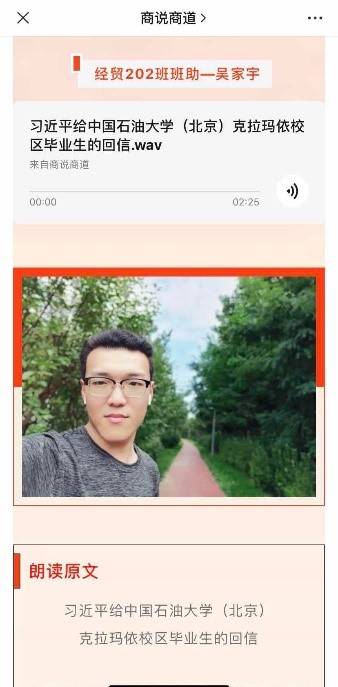 本次活动以商学院微信公众号商说商道为主要依托,采取视听结合的方式,将党建原著和重要讲话精神通过音频和文字的形式同步呈现。本次活动参与的人员除了商学院各学生党支部的学生党员外,还有低年级的学生骨干和入党积极分子。他们用铿锵有力的话语和掷地有声的腔调诠释着自己内心深处对党组织的向往和向党组织靠拢的决心,也向我们诠释着年轻一代的蓬勃朝气和理论学习热情。