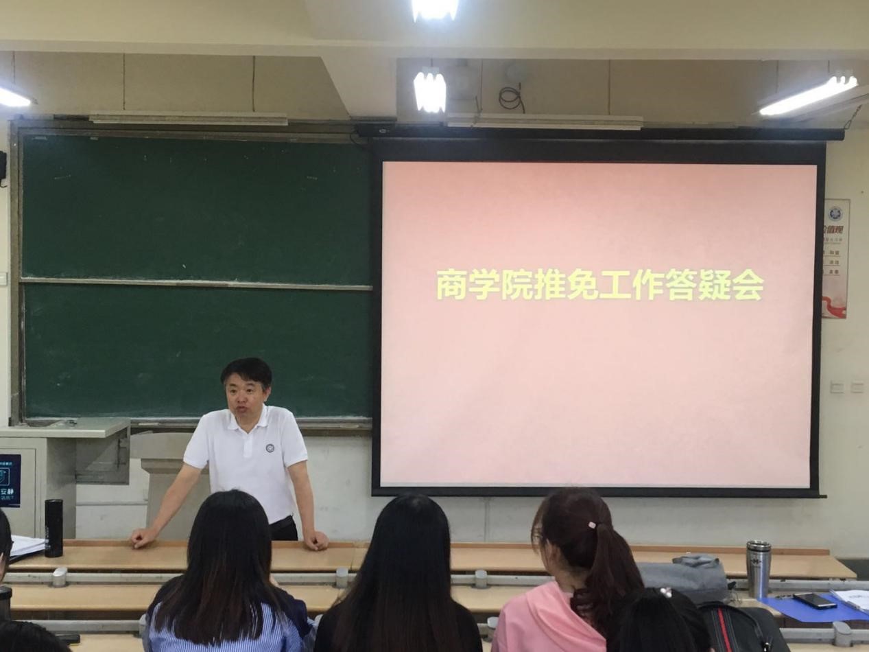 9月28日下午,商学院在主教学楼B302召开2017级本科生推免政策宣讲答疑会。研究生处处长姜培刚、商学院党总支副书记董兰国参加宣讲会。商学院辅导员冯宁主持宣讲会,2017级部分本科生参会。