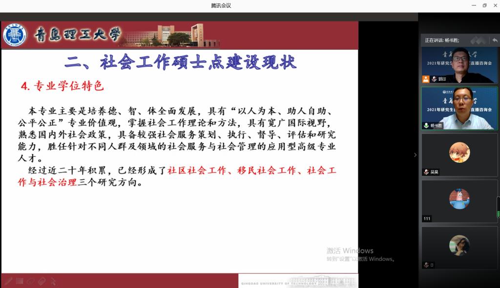 10月15日晚,人文与外国语学院2021级社会工作硕士研究生招生咨询会在腾讯会议网络平台举行。人文与外国语学院副院长郭印,院长助理、社会工作硕士教育中心主任杨书胜等参加会议。