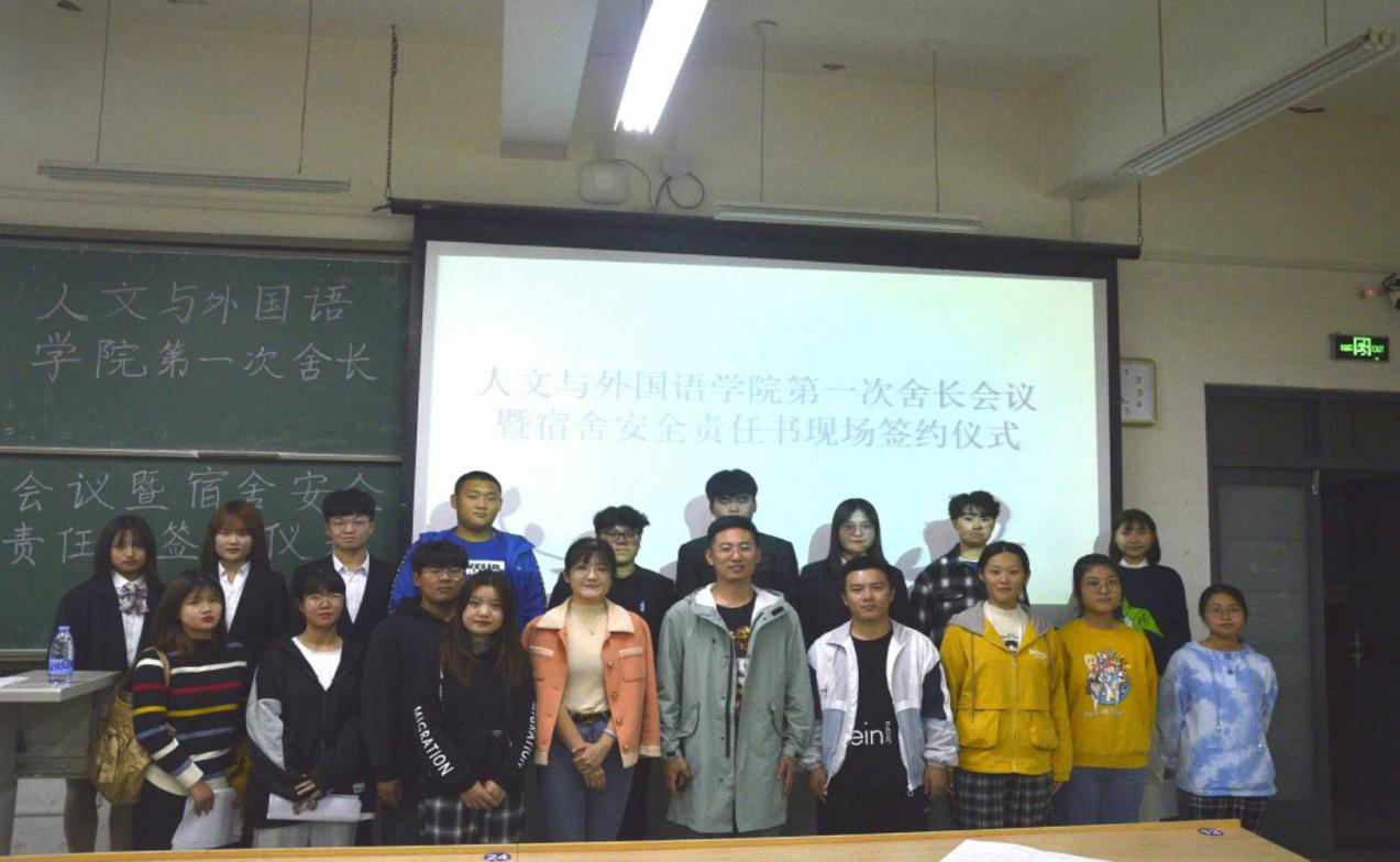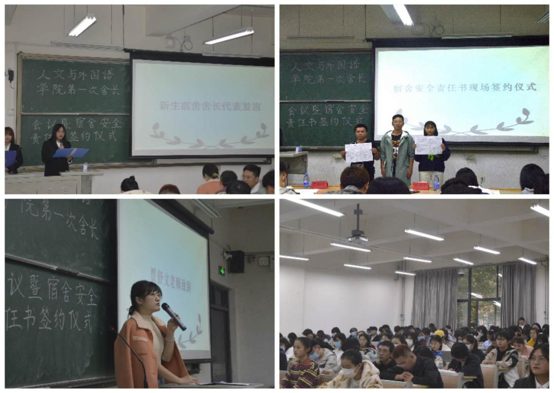 为进一步落实学生宿舍安全工作,更好地迎接学校对学院学生宿舍管理工作的检查评估,切实加强高等学校学生公寓管理工作,进一步改善学生的生活和学习条件,人文与外国语学院于10月21日下午在教学楼B130教室举行2020—2021年度第一届舍长会议暨宿舍安全责任书签约仪式。人文与外国语学院辅导员贾舒文、王才升并全体学生舍长参加。