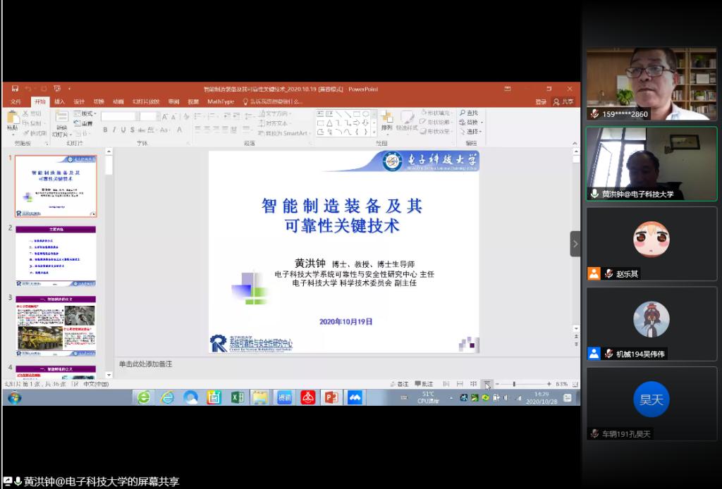 10月28日,机械与汽车工程学院第35期“匠心机车讲坛”开讲,本期讲坛特邀电子科技大学系统可靠性与安全性研究中心主任黄洪钟教授通过线上腾讯会议的方式做了题为“智能制造装备及其可靠性关键技术”的学术报告,机械与汽车工程学院学术委员会主任林天然教授主持报告会, 200余名教师、学生通过线上方式聆听报告。