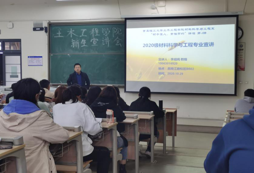 为使新生深入了解材料科学与工程专业,明确未来自身发展方向,使学生能够更好进行自我规划,10月30日下午,土木工程学院于嘉陵江路校区B502教室举办2020级材料科学与工程专业介绍会。本次介绍会由学院党总支副书记邵先锋主持,副院长李绍纯主讲;辅导员李恺和2020级全体材料科学与工程专业新生参加本次介绍会。