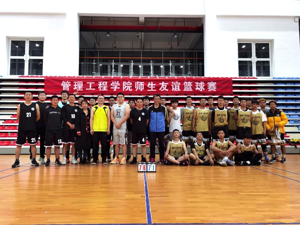 为增进师生之间情感沟通与交流,展现管理工程学院师生健康、和谐、积极进取的精神风貌,丰富师生的课余文化生活,11月4日晚,管理工程学院在体育馆举办师生篮球友谊赛。本次比赛由体育教学部主任张桂青、王军、代滨、李福臻、郭晓东、张钦凯、张宇等教师组成的教师联队对抗分团委书记、学工办主任陈永亮带领的管理工程学生联队,众多同学到现场加油助威,比赛全过程现场直播,共吸引了全校100多名篮球爱好者线上观看。