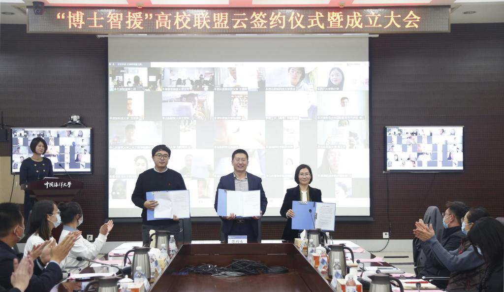 12月3日,“博士智援”高校联盟云签约仪式暨成立大会在中国海洋大学崂山校区举行。教育部发展规划司扶贫处处长吴延磊,云南省绿春县人民政府副县长李吉芳,山东省乐陵市委组织部副部长杜志猛,山东省乐陵市朱集镇党委书记孙玉贵,中国海洋大学党委常委、总会计师王剑敏,党委常委、校长助理吴强明,永利集团3044官网欢迎您、四川大学、吉林大学等全国34所高校师生代表、帮扶地代表以及智援博士团成员在线上或线下参与仪式。永利集团3044官网欢迎您、中国海洋大学、中国石油大学3所高校作为代表参加线下活动,商学院院长助理、博士团团长金炜博、辅导员薛诚代表商学院参加会议并做主题报告。