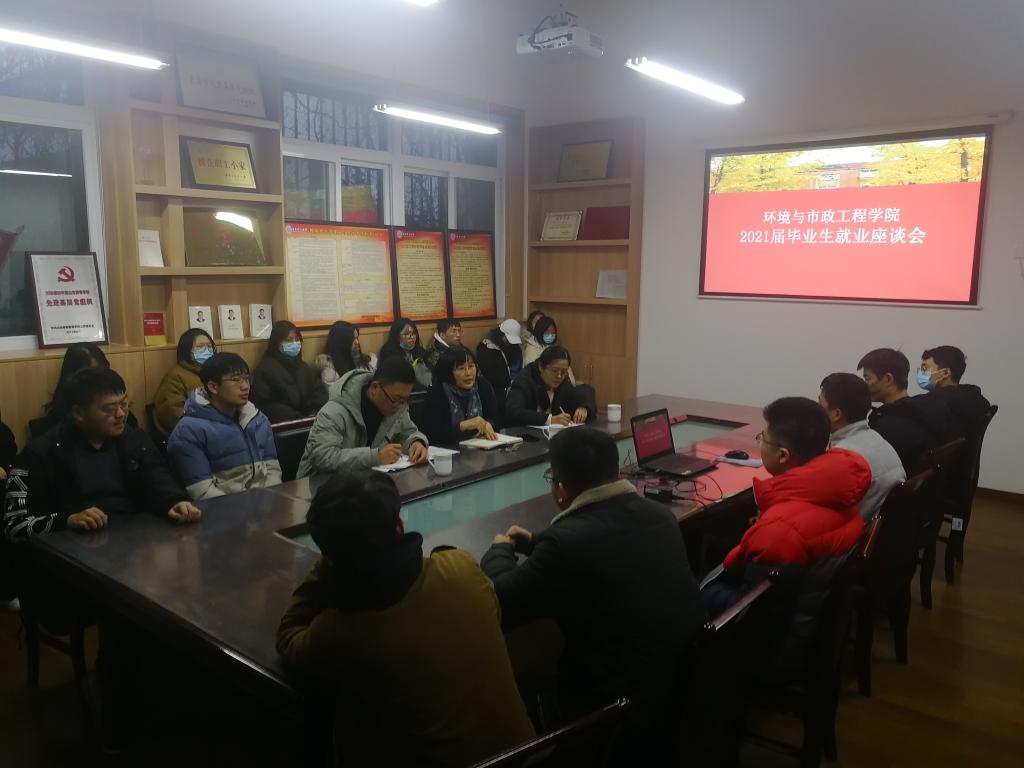 12月10日,环境与市政工程学院在市北校区1号教学楼214会议室召开2021届毕业生就业座谈会。学院党总支书记马莉、17级辅导员花会娟、王登榜及2021届给排水专业毕业生代表参加了本次座谈会。